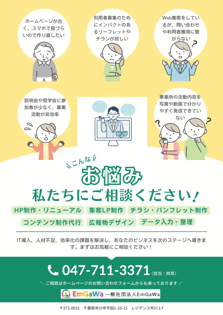 ワンネス市川で「クリエイティブ事業」を開始しました! 2025.11.17 そのほか 「ホームページを作りたい」「チラシ作りたい」「データ入力を外注化したい」 そんな悩みをワンネス市川が解決! ホームページ作成、チラシ作成、データ入力承ります。 一般就労を目指す障がい者の職業訓練の一環として業務を行いますので、相場よりも低予算でお仕事をお受けできます。ぜひご相談ください。